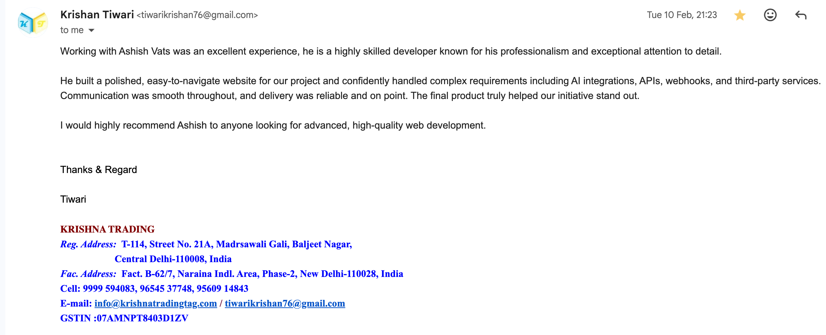 "Working with Ashish Vats was an excellent experience, he is a highly skilled developer known for his professionalism and exceptional attention to detail. He built a polished, easy-to-navigate website for our project and confidently handled complex requirements including Al integrations, APls, webhooks, and third-party services. Communication was smooth throughout, and delivery was reliable and on point. The final product truly helped our initiative stand out. I would highly recommend Ashish to anyone looking for advanced, high-quality web development."
